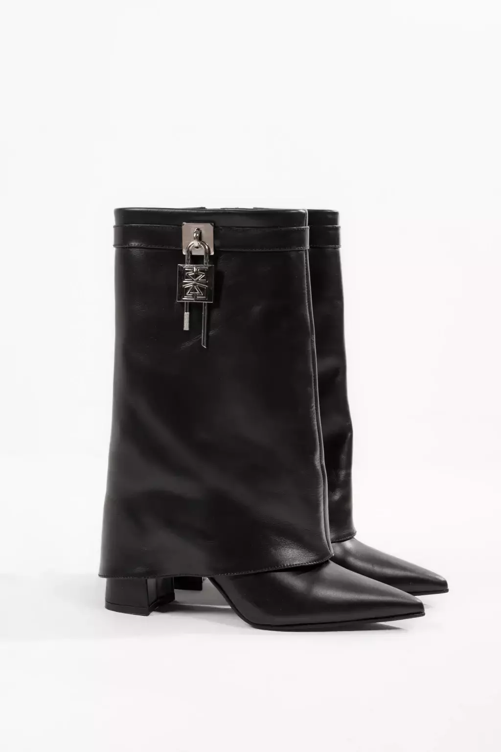 ¡Atención, fashionistas! 😍👢 Les presentamos nuestras botas de cuero con candado decorativo, un must-have que grita "estilo" a los cuatro vientos. Con una caña de 25 cm y un taco de 10 cm, estas bellezas no solo levantan tu look, ¡también te levantan a vos!