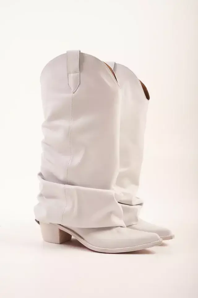 Su diseño volcado abuchonado aporta un estilo inconfundible, ideal para realzar cualquier conjunto con un toque de elegancia atemporal. La caña alta no solo protege, sino que también estiliza la figura, mientras que la terminación cuidada refleja un trabajo artesanal de excelencia.
