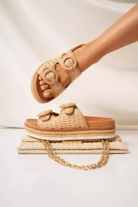 SANDALIA KONRA Descubrí la fusión perfecta entre estilo y confort con la sandalia KONRA, un calzado importado que combina rafia y cuero ecológico de alta calidad. Su plantilla súper acolchonada garantiza una comodidad excepcional durante todo el día, mientras que la hebilla forrada ajustable aporta un detalle sofisticado y un calce seguro.